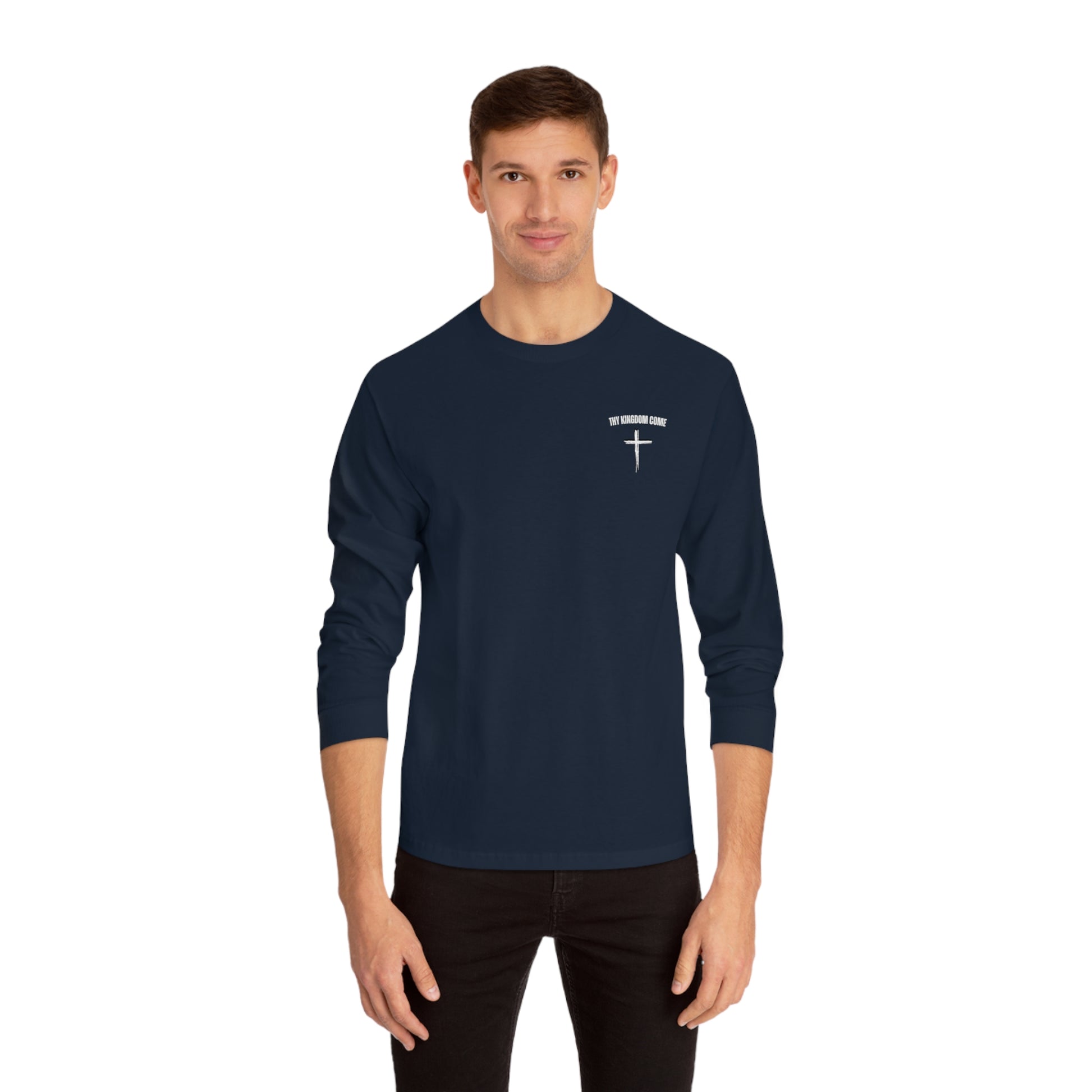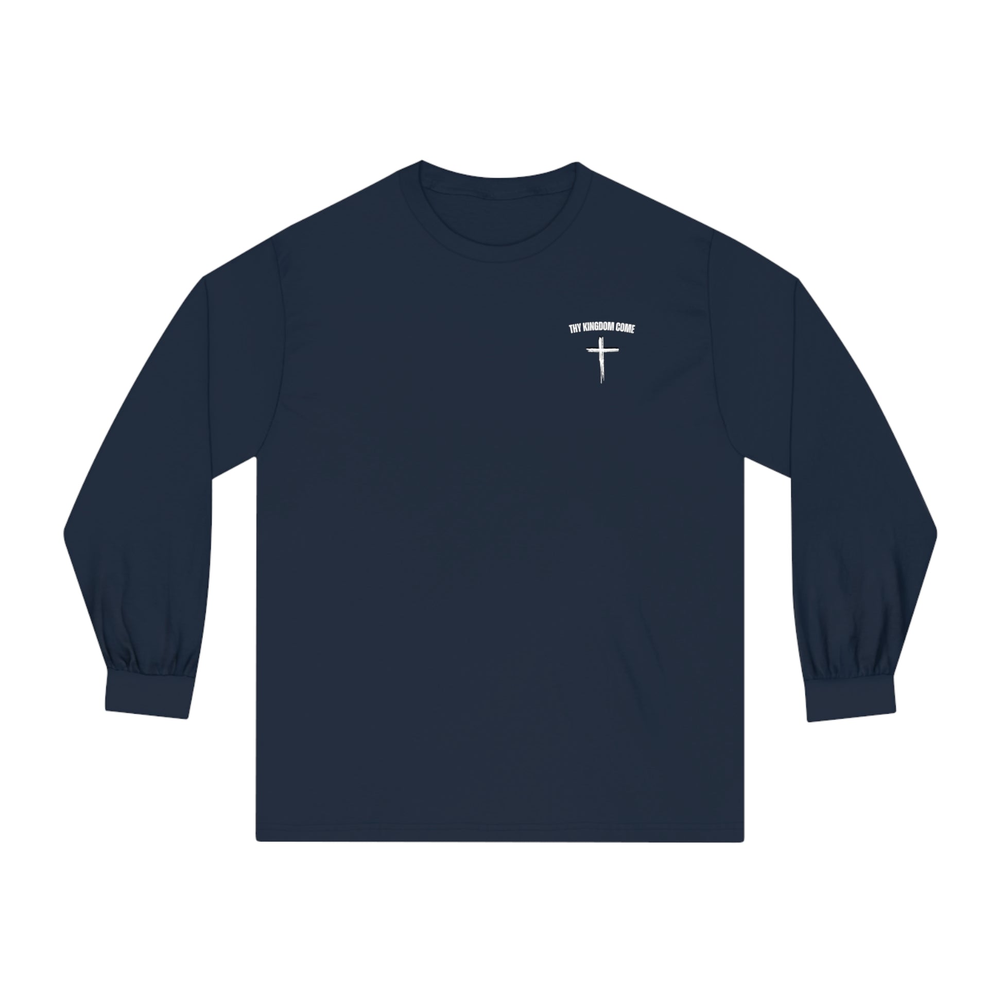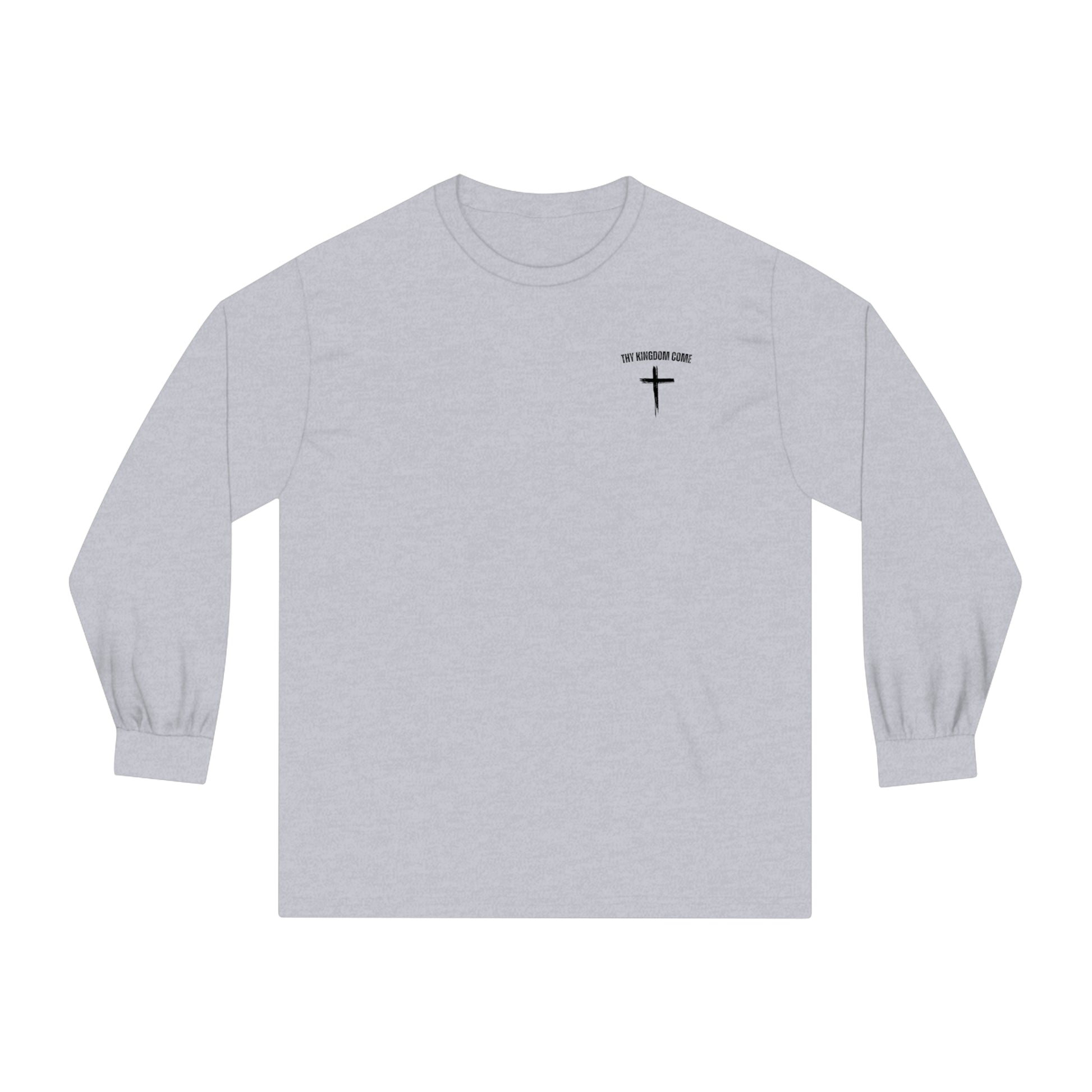 Thy Kingdom Come Long Sleeve. Made with 100% US cotton (Athletic Heather is 90% US cotton 10% polyester), these unisex long-sleeve shirts are a highly versatile choice that stays comfy throughout the day. Their tubular shape provides an easy-going, classic fit that is perfect for any occasion while the ribbed cuffs help maintain the garment's good looks for longer. .: 100% US Cotton (fiber content may vary for different colors) .: Medium fabric (6.0 oz/yd² (203 g/m²)) .: Classic fit .: Tear-away label
